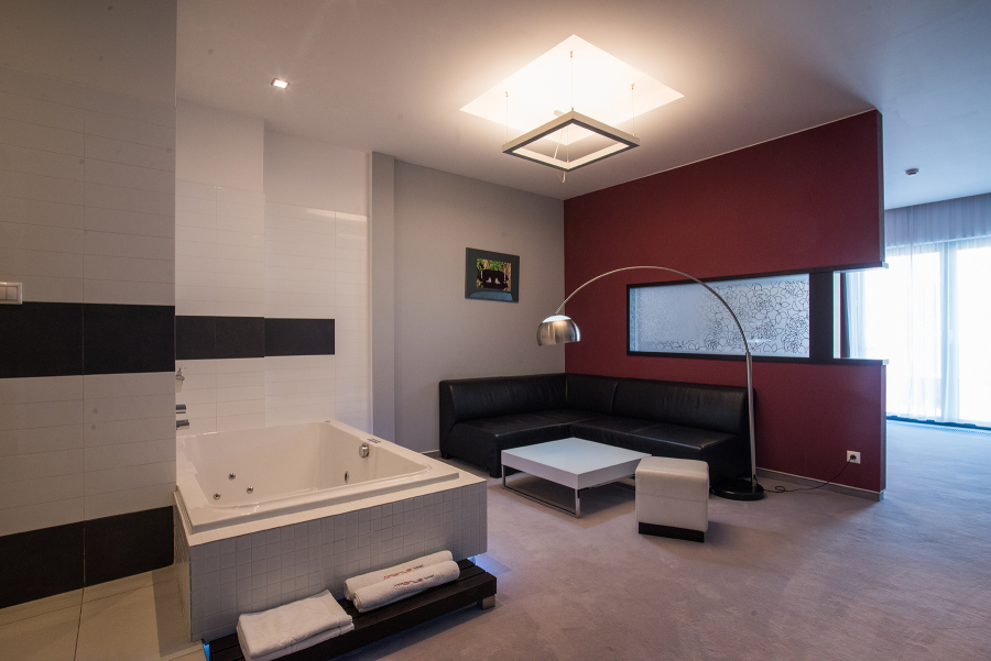 Luxusne zariadená izby s výmerou až 70 m², ktorej súčasťou je veľká manželská posteľ, obývacia časť s posedením a vlastnou vírivkou, priestranná kúpeľňa so sprchou.